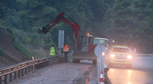 Οι πολύ σφοδρές καταιγίδες και χαλαζοπτώσεις που σημειώθηκαν το μεσημέρι της Τρίτης μεγαλώνουν τον κίνδυνο κάποιας κατολίσθησης και γι’ αυτό τον λόγο στην Εθνική Οδό βρίσκονται μηχανήματα του Δήμου προκειμένου να αποτρέψουν κάτι τέτοιο να συμβεί.