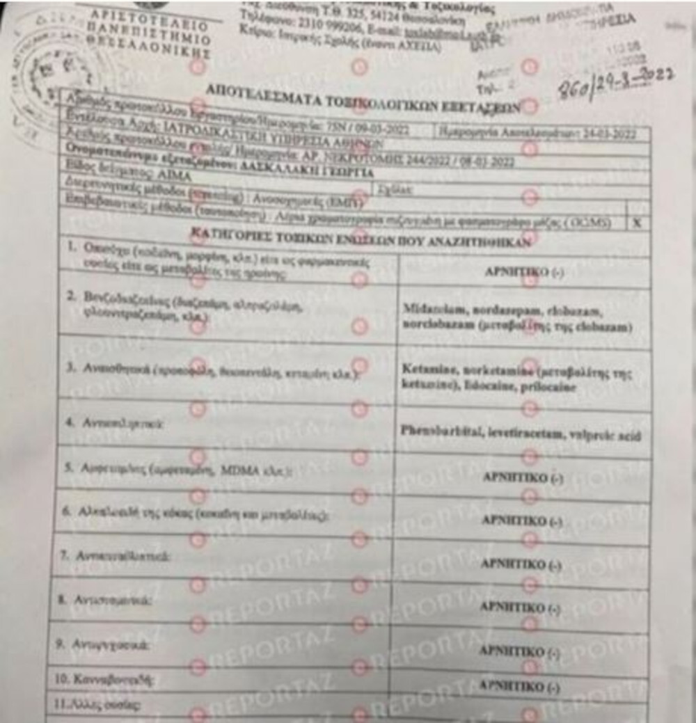 Μάλιστα, σήμερα Σάββατο, ο δημοσιογράφος Πέτρος Κουσουλός έφερε στη δημοσιότητα ντοκουμέντα που δείχνουν πως βρέθηκαν δύο ακόμα ουσίες στο αίμα της Τζωρτζίνας, για τις οποίες αναμένεται να διεξαχθεί ποσοτικός έλεγχος: λιδοκαΐνη και πριλοκαΐνη.