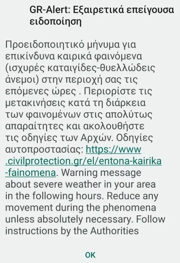 Στο μήνυμα που έφτασε στα τηλέφωνα των πολιτών της Πάτρας αναγράφεται: «Προειδοποιητικό μήνυμα για επικίνδυνα καιρικά φαινόμενα (ισχυρές καταιγίδες-θυελλώδεις άνεμοι) στην περιοχή σας τις επόμενες ώρες. Περιορίστε τις μετακινήσεις κατά τη διάρκεια των φαινομένων στις απολύτως απαραίτητες οδηγίες και ακολουθήστε τις οδηγίες των Αρχών».