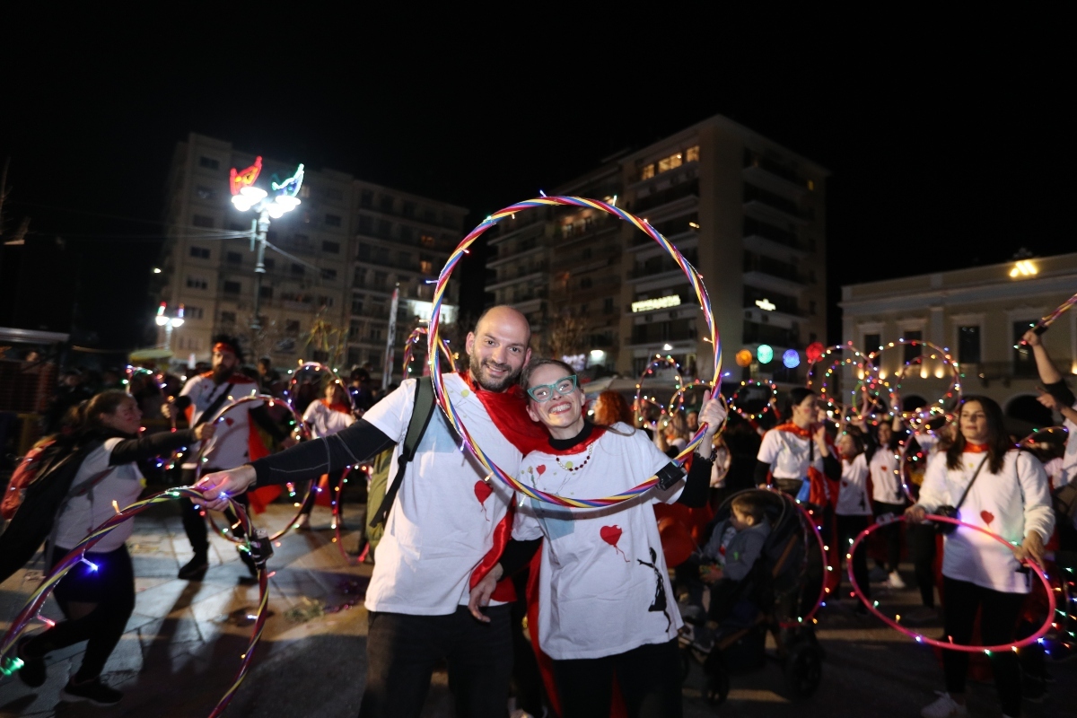 Ένα φαντασμαγορικό θέαμα ξετυλίγεται στην οδό Κορίνθου και στην πλατεία Γεωργίου Α΄ με τους φωτισμούς, τη γρήγορη ροή, τα χρώματα και το κέφι να δίνουν λάμψη και μεγαλοπρέπεια στη νύχτα του τελευταίου Σαββάτου του Πατρινού Καρναβαλιού.