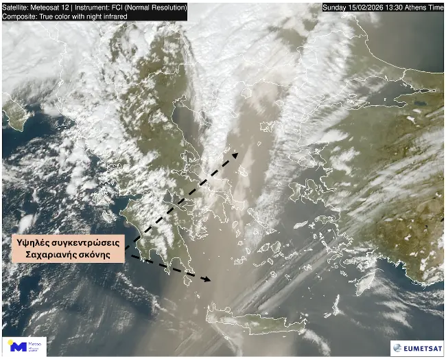 Ενδεικτική της κατάσταση που δημιουργήθηκε λόγω της αυψηλής συγκέντρωσης αφρικανικής σκόνης είναι η δορυφορική εικόνα του ευρωπαïκού δορυφόρου MTG της EUMETSAT.