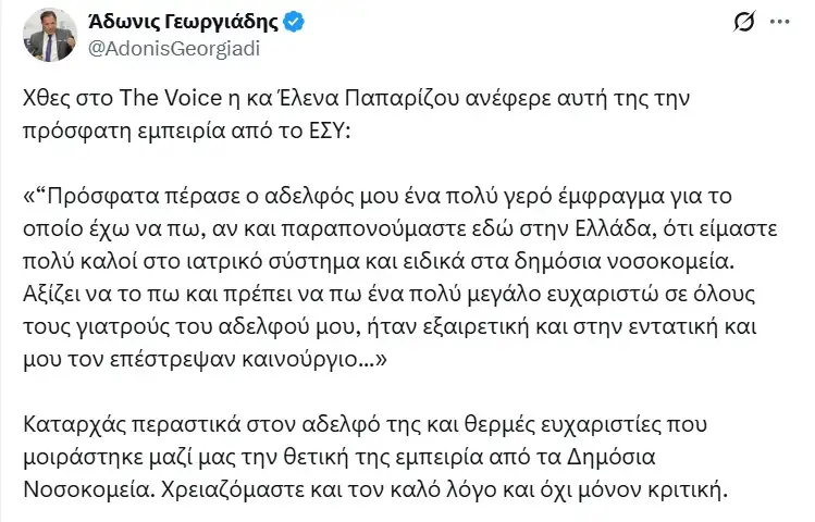 Ο υπουργός Υγείας ευχήθηκε καταρχάς περαστικά στον αδελφό της Έλενας Παπαρίζου, ενώ ευχαρίστησε την τραγουδίστρια που μοιράστηκε δημόσια μια θετική εμπειρία από το Εθνικό Σύστημα Υγείας. «Χρειαζόμαστε και τον καλό λόγο και όχι μόνον κριτική», τόνισε ο κ. Γεωργιάδης, υπογραμμίζοντας τη σημασία που έχει η αναγνώριση της προσπάθειας των γιατρών και του προσωπικού των δημόσιων νοσοκομείων.