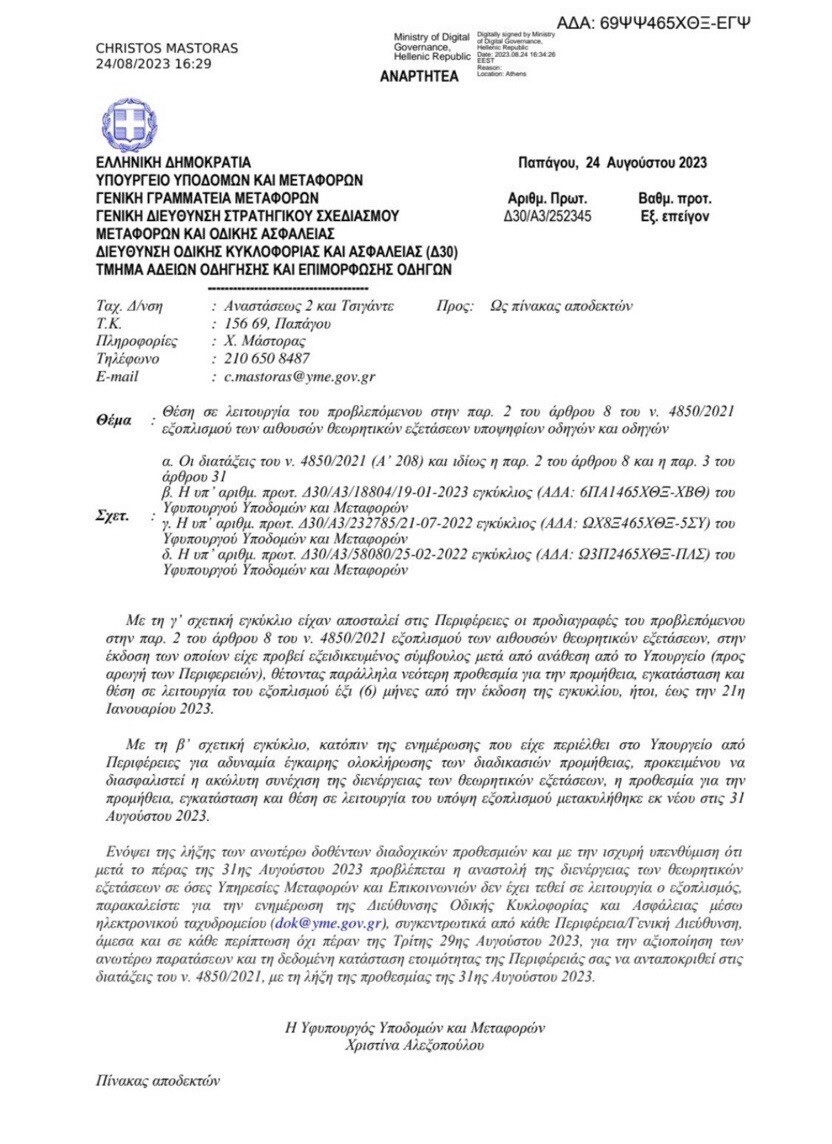 Η εν λόγω απόφαση έχει αποκτήσει και επίσημη μορφή, μέσω εγκυκλίου η οποία υπογράφεται από την Υφυπουργό Υποδομών και Μεταφορών, αρμόδια για θέματα μεταφορών, Χριστίνα Αλεξοπούλου και έχει θέμα: «Θέση σε λειτουργία του προβλεπόμενου εξοπλισμού των αιθουσών θεωρητικών εξετάσεων υποψηφίων οδηγών και οδηγών».