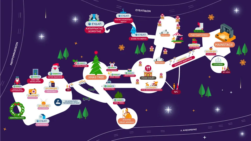Μεγάλος Χορηγός του Χριστουγεννιάτικου Χωριού της Περιφέρειας Αττικής είναι η Protergia, χορηγοί η COSMOTE και η ΕΥΔΑΠ και χορηγός επικοινωνίας το MAD που έχει αναλάβει και το καλλιτεχνικό πρόγραμμα.