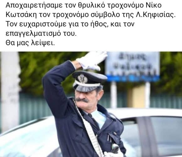Ο Ανθυπαστυνόμος Νίκος Κωτσάκης ήταν η ιδιαίτερη φυσιογνωμία στη διασταύρωση της Λ.Κηφισιάς. Είχε περάσει σε αφυπυρέτηση και είχε κρεμάσει τα λευκά γάντια και την τελαμώνα της Τροχαίας.