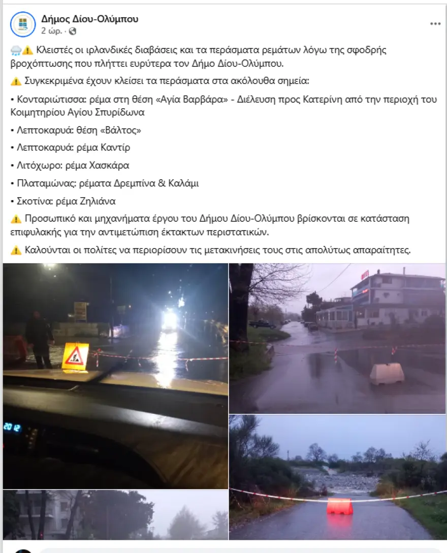Πιέρια: Η ανάρτηση του Δήμου στα μέσα κοινωνικής δικτύωσης ανέφεραν ότι έχουν κλείσει τα περάσματα στα ακόλουθα σημεία: