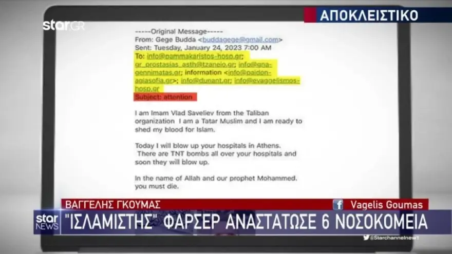 «Στο όνομα του Αλλάχ και του προφήτη μας Μωάμεθ πρέπει να πεθάνετε» έγραφε στο απειλητικό email που στάλθηκε στο αεροδρόμιο «Ελευθέριος Βενιζέλος» και έξι μεγάλα νοσοκομεία και προειδοποιούσε για τοποθέτηση βόμβας.
