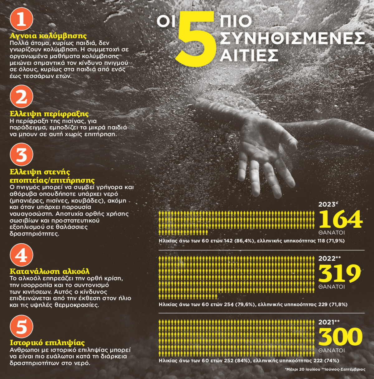 Σύμφωνα με τα στοιχεία του Λιμενικού Σώματος, κάθε χρόνο περίπου 300 άνθρωποι χάνουν τη ζωή τους στη θάλασσα κατά τη διάρκεια της ναυαγοσωστικής περιόδου (Ιούνιος – Σεπτ.). Το 2019 οι θάνατοι ανήλθαν σε 332, ενώ το 2020 (περίοδος πανδημίας) ήταν 213. Το 2021 έφτασαν τους 300, ενώ το 2022 ήταν 319.