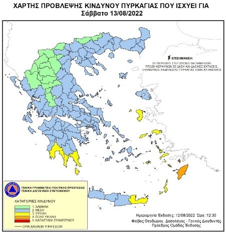 Σύμφωνα με το Χάρτη Πρόβλεψης Κινδύνου Πυρκαγιάς που εκδίδει η Γενική Γραμματεία Πολιτικής Προστασίας του Υπουργείου Προστασίας του Πολίτη (www.civilprotection.gr) στην κατηγορία κινδύνου 4 βρίσκονται Ρόδος, Τήλος και Σύμη, ενώ υψηλός είναι ο κίνδυνος σε Κύθηρα, περιοχές της Μεσσηνίας και της Λακωνίας, Δωδεκάνησα, Λασίθι και νησιά του ανατολικού Αιγαίου (κατηγορία κινδύνου 3).