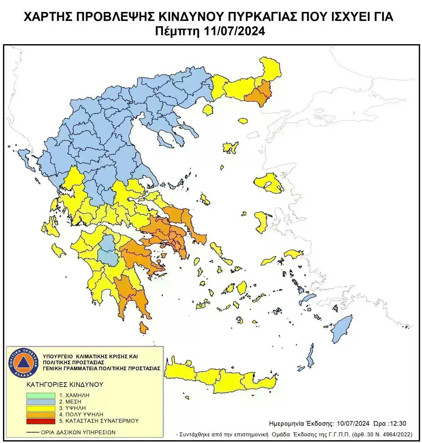 Σύμφωνα με το Χάρτη Πρόβλεψης Κινδύνου Πυρκαγιάς που εκδίδει η Γενική Γραμματεία Πολιτικής Προστασίας του Υπουργείου Κλιματικής Κρίσης & Πολιτικής Προστασίας (civilprotection.gov.gr), για αύριο Πέμπτη 11 Ιουλίου 2024, προβλέπεται πολύ υψηλός κίνδυνος πυρκαγιάς (κατηγορία κινδύνου 4) για τις εξής περιοχές:
