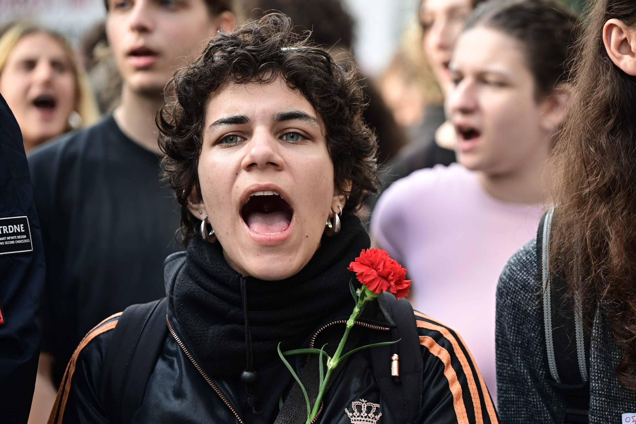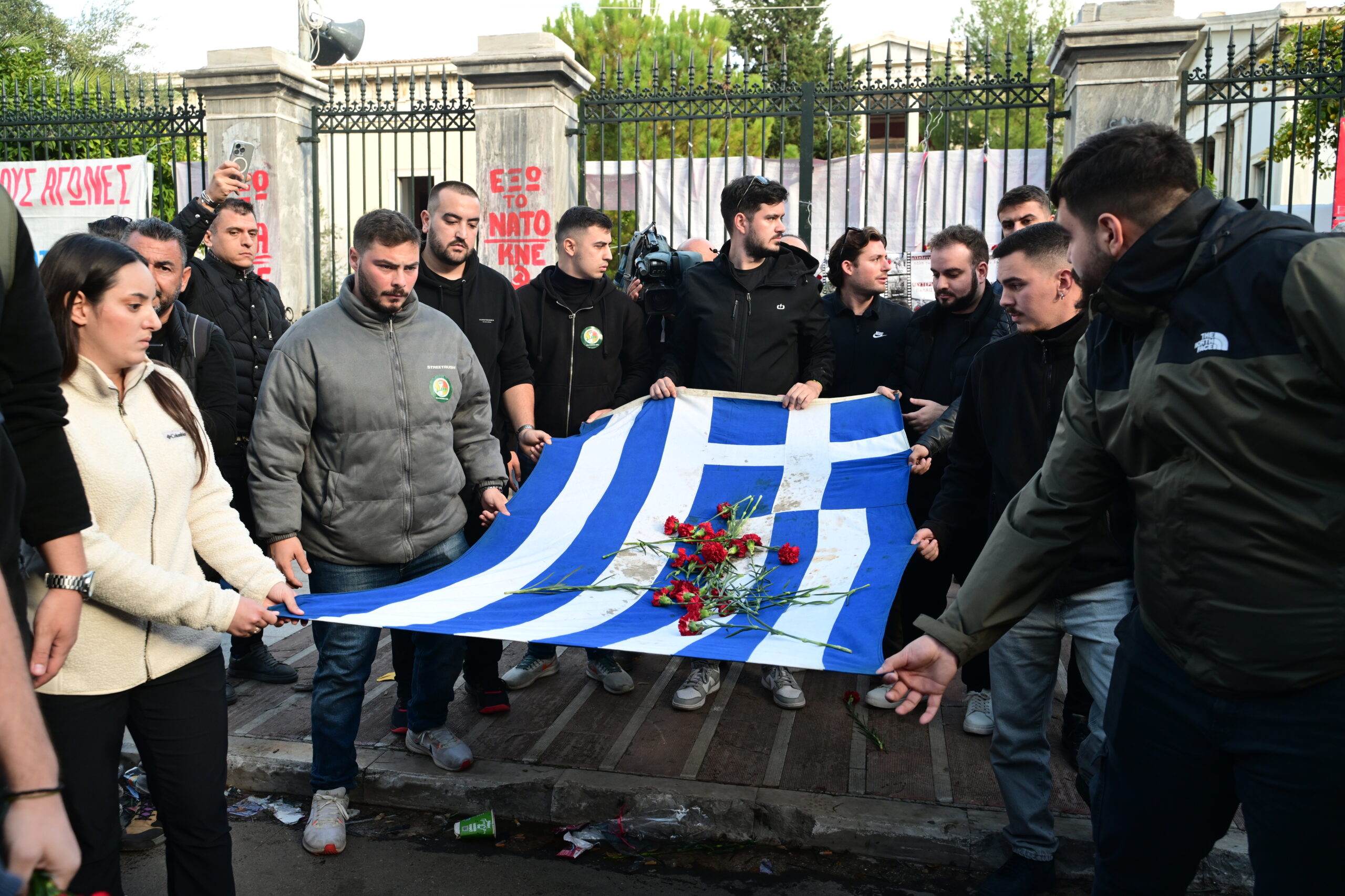 Άνθρωποι όλων των ηλικιών, φοιτητικοί σύλλογοι, οργανώσεις και συνδικάτα προχωρούν προς την αμερικανική πρεσβεία, ενώ αρκετοί κρατούν σημαίες της Παλαιστίνης και φορούν παλαιστινιακά μαντίλια – καφίγια.