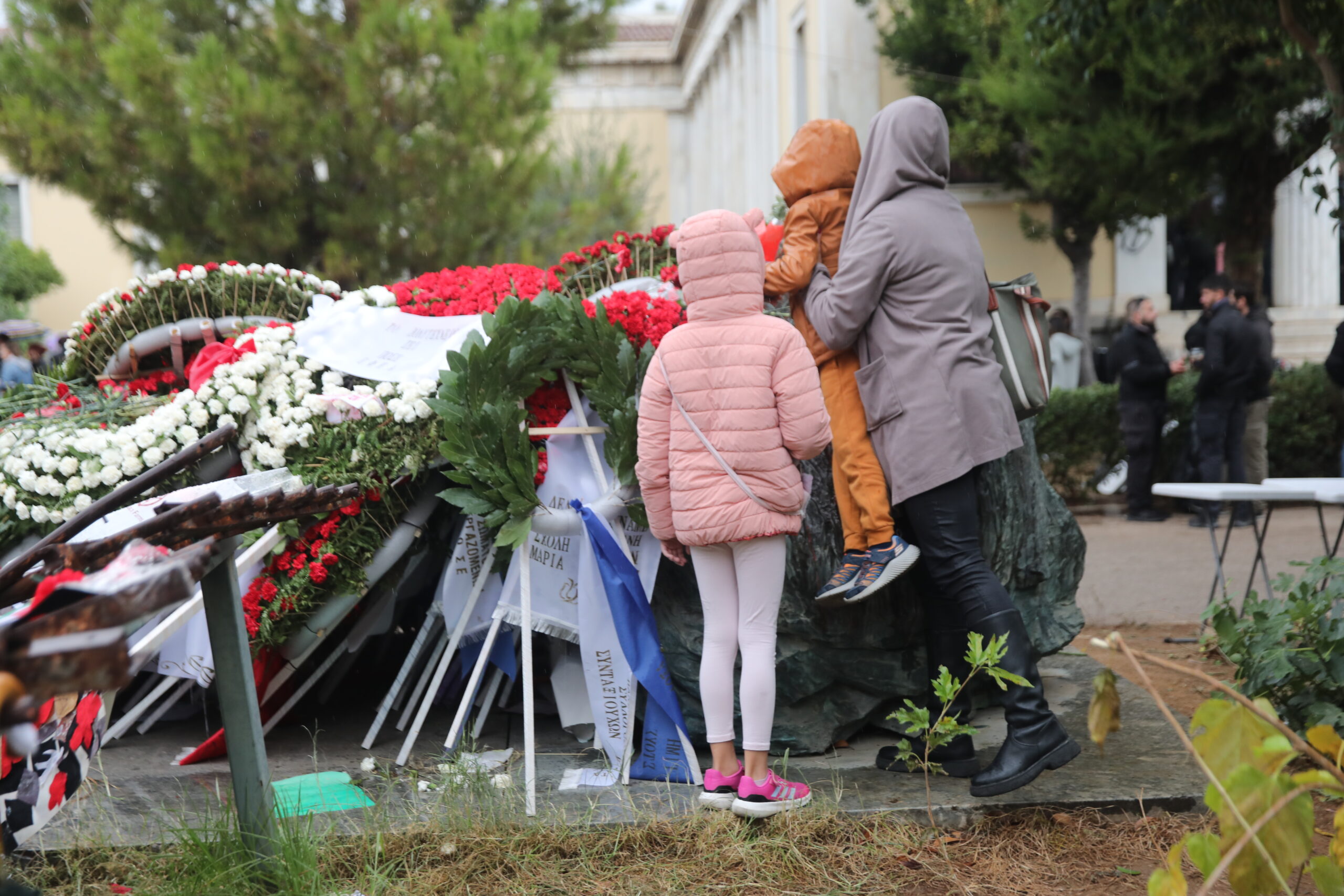 Οικογένειες με παιδιά έρχονται επίσης να αποτίσουν φόρο τιμής, με ένα λουλούδι ή μια ζωγραφιά και οι γονείς εξηγούν στα μικρά παιδιά τους γιατί έχουν έρθει εδώ. «Βρέξει-χιονίσει, είχαμε πει ότι θα έρθουμε, γιατί είναι πολύ σημαντικό να τιμήσουμε την επέτειο της εξέγερσης του Πολυτεχνείου», τόνισε ο πατέρας ενός εξάχρονου παιδιού.