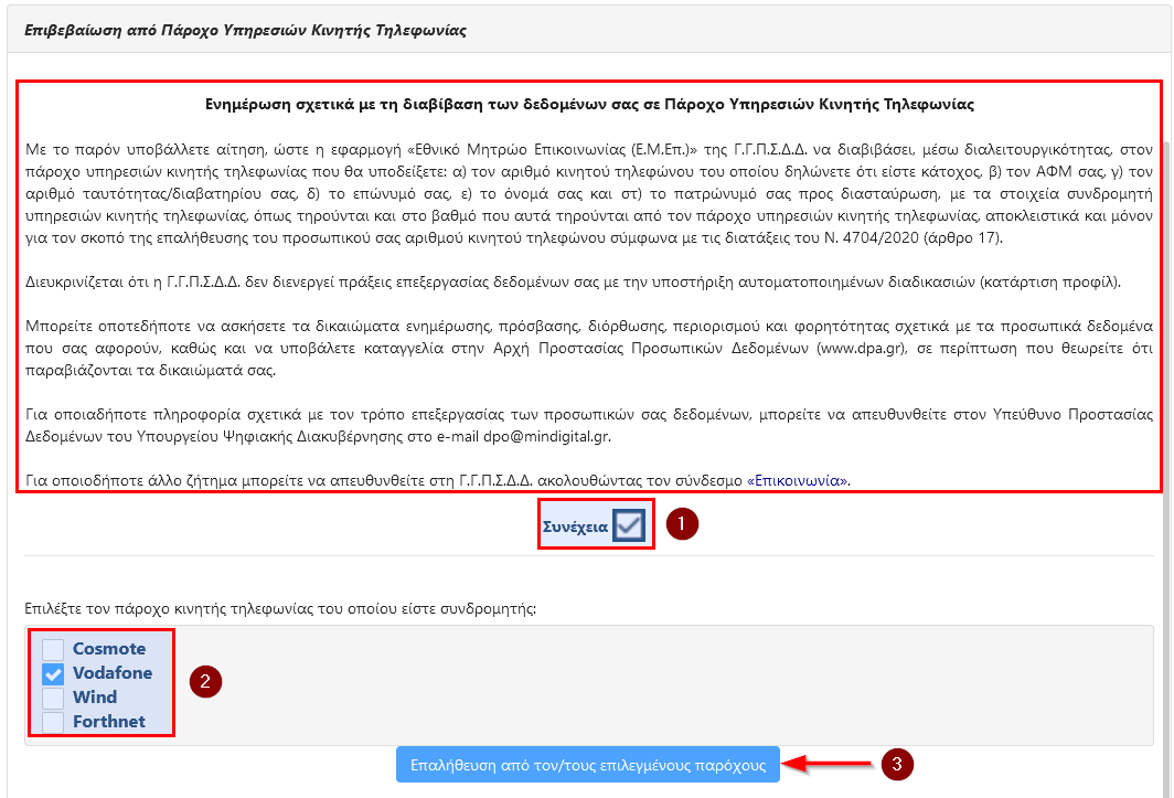 - Επιβεβαίωση από Πάροχο Υπηρεσιών Κινητής Τηλεφωνίας Επιλέγοντας το πλαίσιο «Συνέχεια», διαβιβάζονται τα στοιχεία σας (αριθμός κινητού τηλεφώνου του οποίου δηλώνετε ότι είστε κάτοχος, ΑΦΜ, αριθμός ταυτότητας / διαβατηρίου, επώνυμο, όνομα και πατρώνυμο) στον πάροχο υπηρεσιών κινητής τηλεφωνίας που θα υποδείξετε, αποκλειστικά και μόνον για τον σκοπό της επαλήθευσης του προσωπικού σας αριθμού κινητού τηλεφώνου.