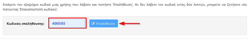 - Θα πρέπει να εισάγετε τον κωδικό αυτό στο πεδίο “Κωδικός Επαλήθευσης” και να πατήσετε Επαλήθευση.Ο κωδικός σας είναι έγκυρος για 2 λεπτά