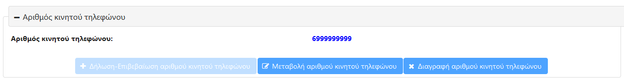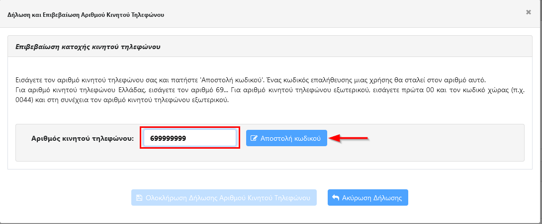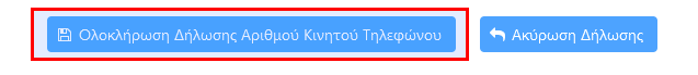 - Επιβεβαίωση αριθμού Κινητού Τηλεφώνου Όταν ο αριθμός του κινητού σας τηλεφώνου επαληθευτεί από κάποια από τις παραπάνω μεθόδους θα ενεργοποιηθεί το κουμπί «Ολοκλήρωση Δήλωσης Αριθμού Κινητού Τηλεφώνου». Πατήστε το για να ολοκληρωθεί η καταχώρηση.