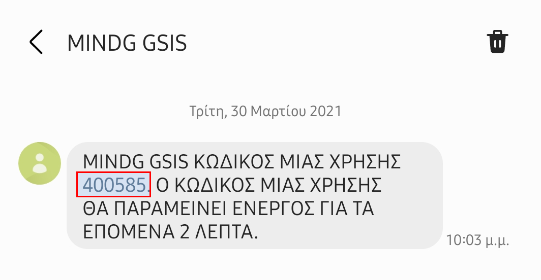 - Σε πολύ λίγο θα λάβετε ένα γραπτό μήνυμα (SMS) που θα περιέχει τον 6ψήφιο κωδικό μιας χρήσης.Αν δεν λάβετε τον κωδικό εντός 2 λεπτών μπορείτε να πατήσετε το κουμπί Επαναποστολή