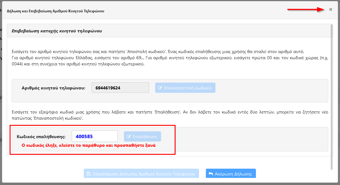 - Για να προσπαθήσετε ξανά τη διαδικασία θα πρέπει να κλείσετε το παράθυρο είτε πατώντας το Χ στα δεξιά του τίτλου “Δήλωση και Επιβεβαίωση Αριθμού Κινητού Τηλεφώνου”, όπως φαίνεται στην εικόνα, είτε πατώντας το κουμπί “Ακύρωση Δήλωσης”.Προσοχή: Μην πατήσετε το Χ που κλείνει το παράθυρο περιήγησης