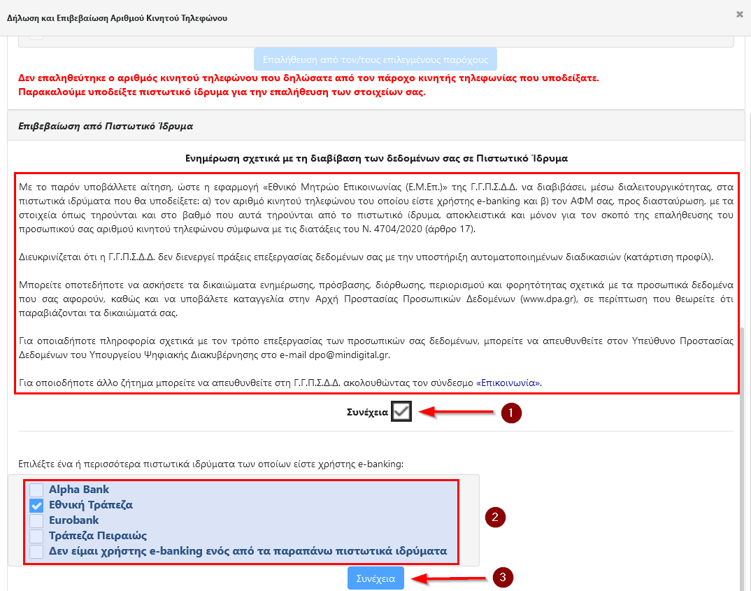 Στην περίπτωση αυτή μπορείτε να υποβάλετε αίτηση ώστε η εφαρμογή του Ε.Μ.Επ. να διαβιβάσει τα ακόλουθα στοιχεία σας, μέσω διαλειτουργικότητας, στα πιστωτικά ιδρύματα που θα υποδείξετε και των οποίων είστε χρήστης e-banking, αποκλειστικά και μόνον για τον σκοπό της επαλήθευσης του προσωπικού σας αριθμού κινητού τηλεφώνου:τον αριθμό κινητού τηλεφώνου που δηλώσατε ότι είστε κάτοχος και