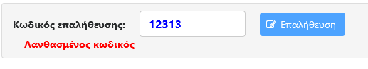 - Σε περίπτωση που εισάγετε λανθασμένα τον κωδικό θα εμφανιστεί αντίστοιχο μήνυμα. Διορθώστε τον και πατήστε εκ νέου το κουμπί Επαλήθευση