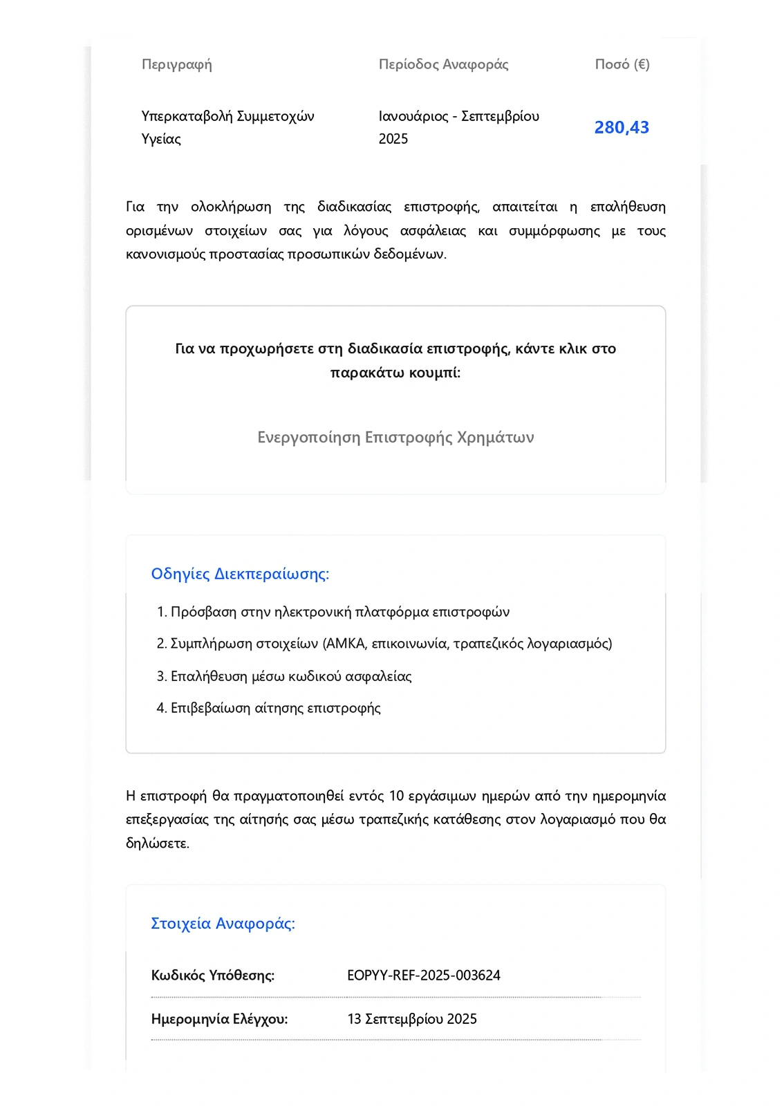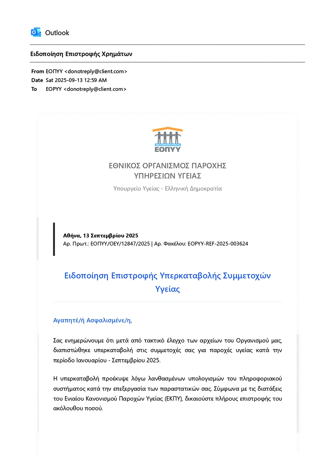 «Στόχος είναι να σας παροτρύνουν να πατήσετε έναν σύνδεσμο για να προχωρήσει η διαδικασία, ο οποίος, όμως, στην πραγματικότητα οδηγεί σε κακόβουλες ιστοσελίδες, που αποσκοπούν στην υποκλοπή των τραπεζικών σας κωδικών ή άλλων προσωπικών δεδομένων», προειδοποιεί σε ανακοίνωσή του ο ΕΟΠΥΥ, που έχει λάβει ήδη πλήθος καταγγελιών από ασφαλισμένους, οι οποίοι πήγαν να πέσουν στην «παγίδα». Είναι ενδεικτικό ότι οι απατεώνες είχαν μέσα στο e-mail ειδική ετικέτα, πάνω στην οποία ανέφεραν «Ενεργοποίηση Επιστροφής Χρημάτων». Οταν τα θύματα πατούσαν πάνω της, ουσιαστικά οδηγούνταν σε ειδικό χώρο υποκλοπής των προσωπικών τους δεδομένων. Μάλιστα, η επιστολή είχε υπογραφή από τον… ανύπαρκτο «Ιωάννη Παπαδόπουλο, προϊστάμενο του Τμήματος Οικονομικής Διαχείρισης».