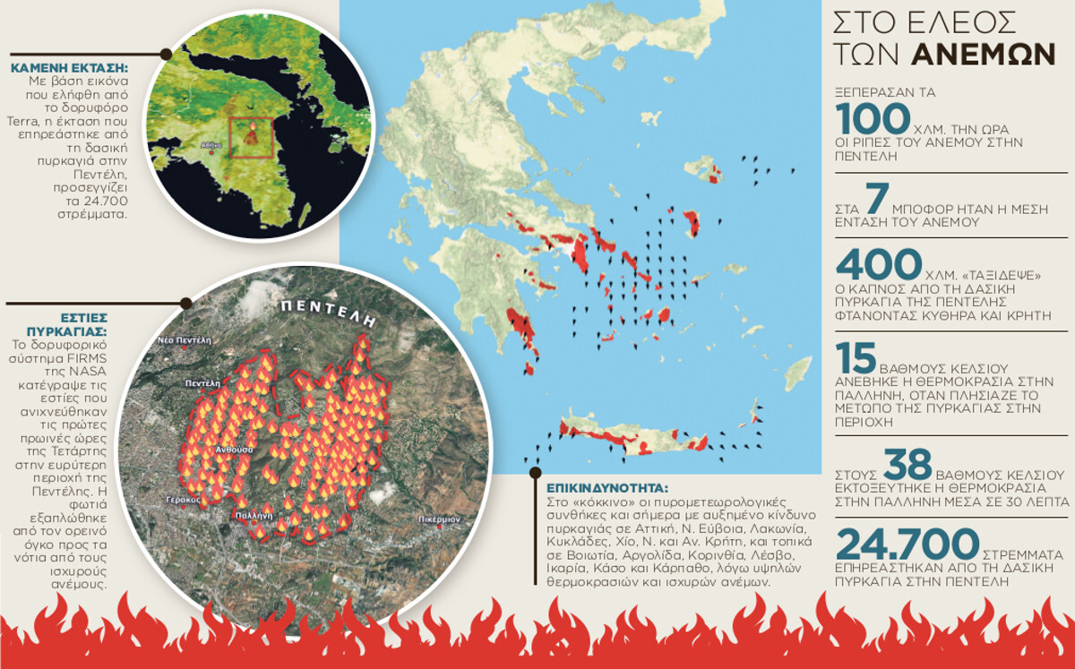 Αντίστοιχες συνθήκες ήταν αυτές που προκάλεσαν τη γρήγορη εξάπλωση της πυρκαγιάς στην ευρύτερη περιοχή Νταού Πεντέλης το απόγευμα της Τετάρτης. Οι άνεμοι έπνεαν 5-6 μποφόρ και οι μεγάλες εντάσεις του ανέμου καθώς και των ισχυρών ριπών προκάλεσαν νέες εστίες στις γύρω περιοχές.