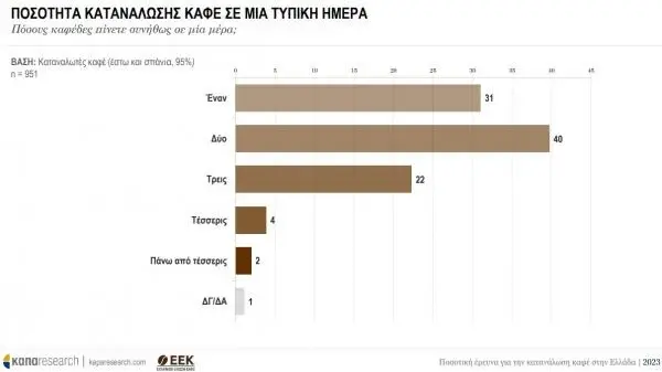 Όπως προκύπτει από τα βασικά ευρήματα της έρευνας η κατανάλωση καφέ είναι μια ισχυρή νεοελληνική παράδοση, καθότι το 95% των Ελλήνων αγοράζουν καφέ. Περισσότεροι από 8 στους 10 ερωτηθέντες πίνουν καφέ καθημερινά (84%), ενώ οι περισσότεροι από αυτούς που δεν πίνουν (66%), φροντίζουν να εφοδιάζουν με καφέ το νοικοκυριό τους. Το 50% των ερωτηθέντων θα καταναλώσουν πάνω από́ έναν καφέ την ημέρα (συνήθως 2 ή 3).