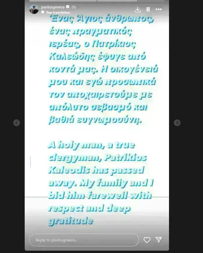 «Ένας Άγιος άνθρωπος, ένας πραγματικός ιερέας, ο Πατρίκιος Καλεώδης έφυγε από κοντά μας. Η οικογένειά μου κι εγώ προσωπικά τον αποχαιρετούμε με απόλυτο σεβασμό και βαθιά ευγνωμοσύνη», έγραψε χαρακτηριστικά.
