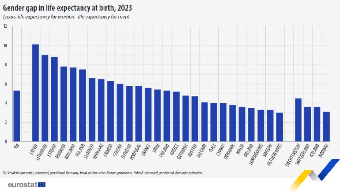Σε όλες τις χώρες της Ευρώπης οι γυναίκες έχουν υψηλότερο προσδόκιμο ζωής από τους άνδρες, με το μέσο όρο της διαφοράς για το 2023 να διαμορφώνεται στα 5,3 έτη (78,7 οι άνδρες, 84 οι γυναίκες). Στα 5,2 διαμορφώθηκε η διαφορά στην Ελλάδα (79,2 οι άνδρες, 84,4 οι γυναίκες).