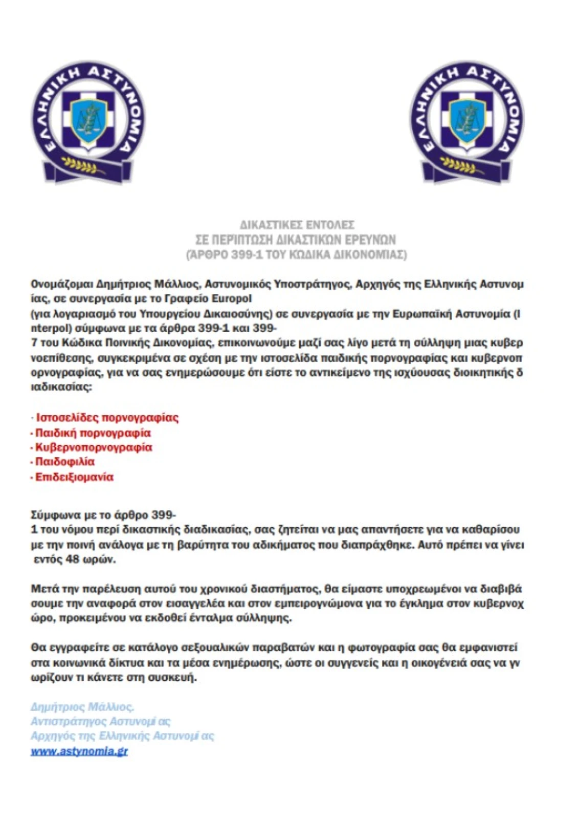 Συγκεκριμένα, οι δράστες χρησιμοποιώντας τα στοιχεία αυτά σε επιστολή δήθεν αρμόδιων ελεγκτικών Aρχών, προσπαθούν να εξαπατήσουν πολίτες – χρήστες του διαδικτύου, με το πρόσχημα ότι ο αποδέκτης τους εμπλέκεται σε υπόθεση παιδικής πορνογραφίας και άλλων αδικημάτων. Στο πλαίσιο αυτό, ανακοινώνεται ότι το παρακάτω κείμενο – μήνυμα που διακινείται μέσω ηλεκτρονικού ταχυδρομείου (email), είναι καταφανώς ψευδεπίγραφο και απατηλό και αποστέλλεται από δράστες που επιχειρούν προφανώς να εξαπατήσουν – παραπλανήσουν τους πολίτες και ακολούθως να αποκομίσουν παράνομο οικονομικό όφελος.
