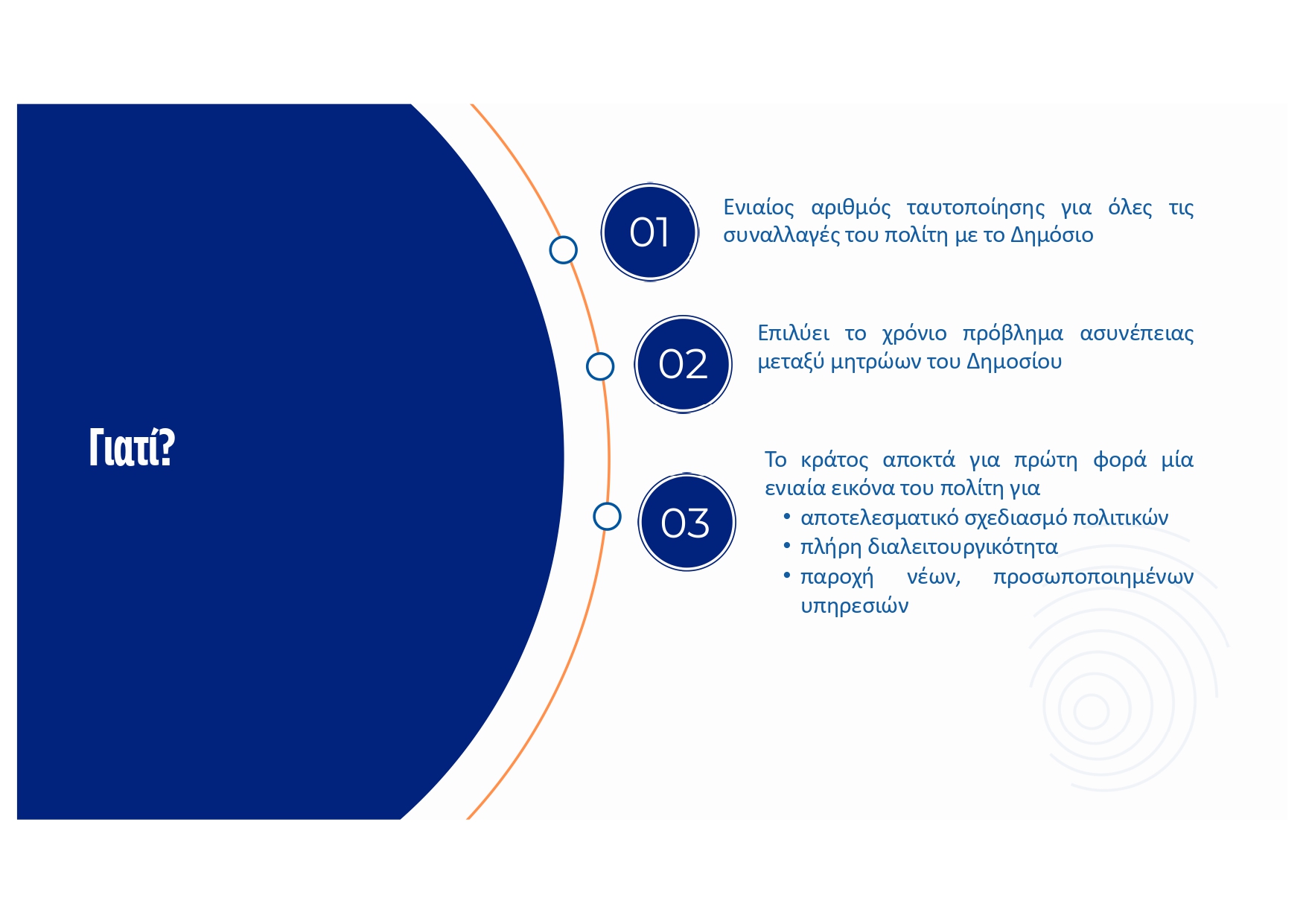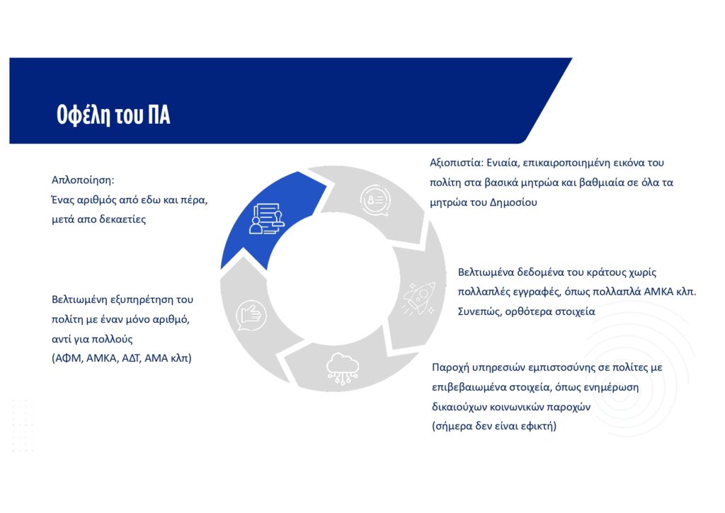 Ο νέος αριθμός θα είναι μοναδικός και δεν θα μεταβάλλεται κατά τη διάρκεια της ζωής του πολίτη. Με τον τρόπο αυτό θα βελτιωθεί η παροχή υπηρεσιών και παράλληλα θα αντιμετωπιστούν χρόνια κενά στη διασύνδεση κρατικών μητρώων, που είχαν ως συνέπεια την ταλαιπωρία των πολιτών και τον περιορισμό της αποτελεσματικότητας των υπηρεσιών του Δημοσίου.