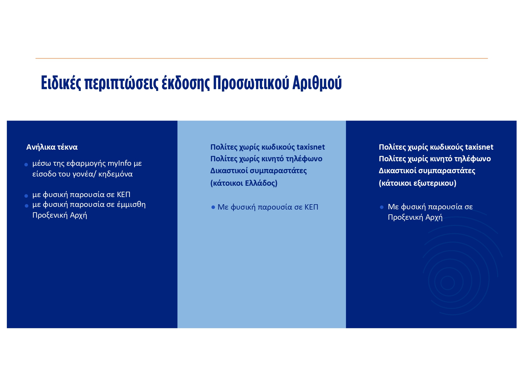 Όπως επισημαίνεται στο Προεδρικό Διάταγμα, τα φυσικά πρόσωπα ακολουθούν τις αντίστοιχες διαδικασίες και για την έκδοση Προσωπικού Αριθμού για τα ανήλικα προστατευόμενα μέλη τους.