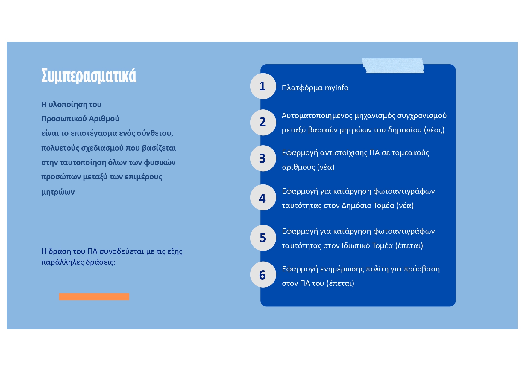 Προσδιορίσατε τη διαδικασία με την οποία θα εκδίδεται ο Προσωπικός Αριθμός, ο οποίος από εδώ και στο εξής θα αναγράφεται και στις καινούργιες ταυτότητες. Να πούμε, επίσης, ότι οι μπλε ταυτότητες, έτσι όπως τις ξέραμε, θα αποτελούν σύντομα -και πρέπει να αποτελούν βάσει ευρωπαϊκής οδηγίας- παρελθόν. Και σε συνεργασία με το Υπουργείο Προστασίας του Πολίτη κάνουμε το καλύτερο δυνατό ώστε να περιορίσουμε τις αναμονές για την έκδοση των νέων ταυτοτήτων.