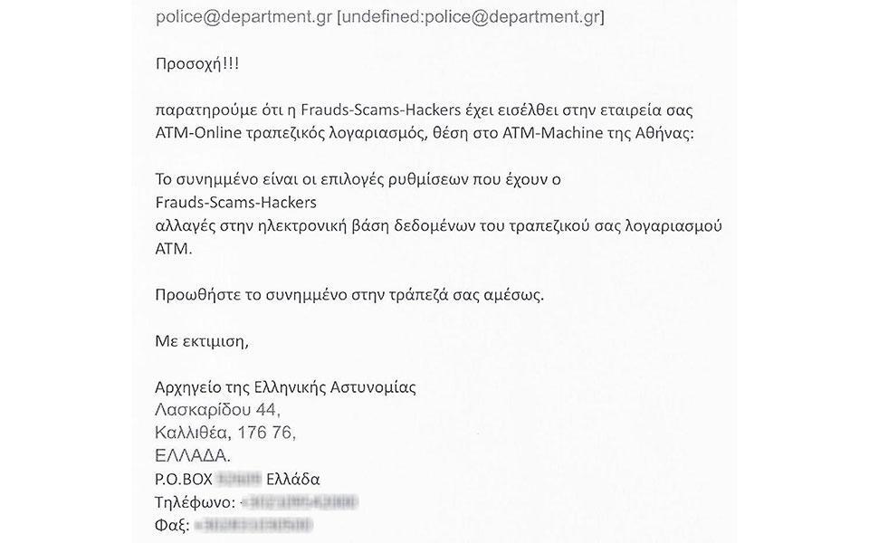 Σημειώνεται, ότι ο αποστολέας των μηνυμάτων «υπογράφει» ως «Αρχηγείο της Ελληνικής Αστυνομίας», με ταχυδρομική διεύθυνση και τηλέφωνο επικοινωνίας που αντιστοιχούν σε αστυνομική υπηρεσία, ενώ ο αριθμός fax που αναφέρεται ανήκει σε ιδιωτική εταιρεία.