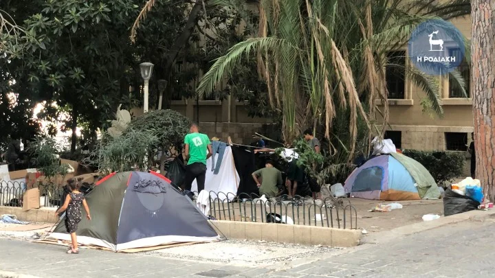 Οι μετανάστες έχουν στήσει σκηνές σε διάφορα σημεία της πόλης της Ρόδου, ενώ κάποιοι απλά ξαπλώνουν πάνω σε χαρτόκουτα, χωρίς ούτε τα στοιχειώδη για την καθημερινή υγιεινή τους και διαβίωσή τους.