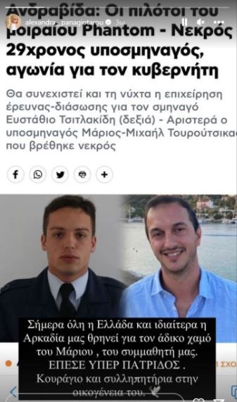 Από την Αρκαδία, έχει επίσης καταγωγή η Αλεξάνδρα Παναγιώταρου η οποία ήταν συμμαθήτρια με τον άτυχο πιλότο γι’ αυτό θέλησε να του πει ένα συγκινητικό αντίο μέσα από μία ανάρτηση στο Instagram.