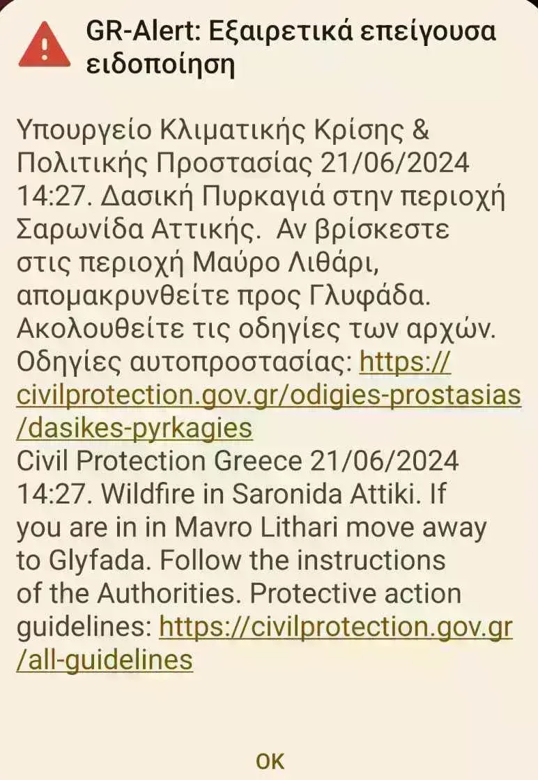 Πριν λίγο εστάλη και μήνυμα από το 112 το οποίο λέει στους κατοίκους να είναι σε ετοιμότητα. Λίγη ώρα αργότερα εστάλη και νέο μήνυμα το οποίο έλεγε για απομάκρυνση προς την Γλυφάδα.