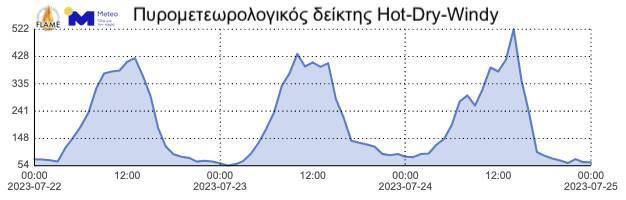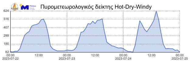 Τέλος, με βάση τα πιο πρόσφατα προγνωστικά στοιχεία της Πυρομετεωρολογικής Ομάδας FLAME του ΜΕΤΕΟ/ΕΑΑ (Εικόνες 3, 4), αναμένεται πρόσκαιρη και μερική βελτίωση των πυρομετεωρολογικών συνθηκών λόγω της σχετικής εξασθένησης των ανέμων. Θα πρέπει ωστόσο να σημειωθεί πως η ευφλεκτότητα των νεκρών δασικών καυσίμων θα παραμείνει ιδιαίτερα υψηλή και κατά τη διάρκεια των νυχτερινών ωρών (τιμές περιεχόμενης υγρασίας κάτω του 9-10%), γεγονός που αναμένεται να δυσχεράνει τον έλεγχο της φωτιάς. Σημαντικό είναι να τονιστεί ότι από τις πρώτες πρωινές ώρες εώς τις μεσημβρινές ώρες της Κυριακής 23.07.2023, στο δυτικό μέτωπο της πυρκαγιάς αναμένεται πρόσκαιρη μεταβολή της διεύθυνσης του ανέμου σε Β/ΒΑ, ενώ μετά τις μεσημβρινές ώρες αναμένουμε εκ νέου στροφή των ανέμων σε Β/ΒΔ διευθύνσεις. Οι πλέον δυσμενείς πυρομετεωρολογικές συνθήκες αναμένονται κατά τις θερμές ώρες (11:00 – 18:00) της Κυριακής 23.07.2023, οπότε και η ένταση των ανέμων θα αυξηθεί με την ευφλεκτότητα να είναι εξαιρετικά υψηλή (τιμές περιεχόμενης υγρασίας κάτω του 7%).