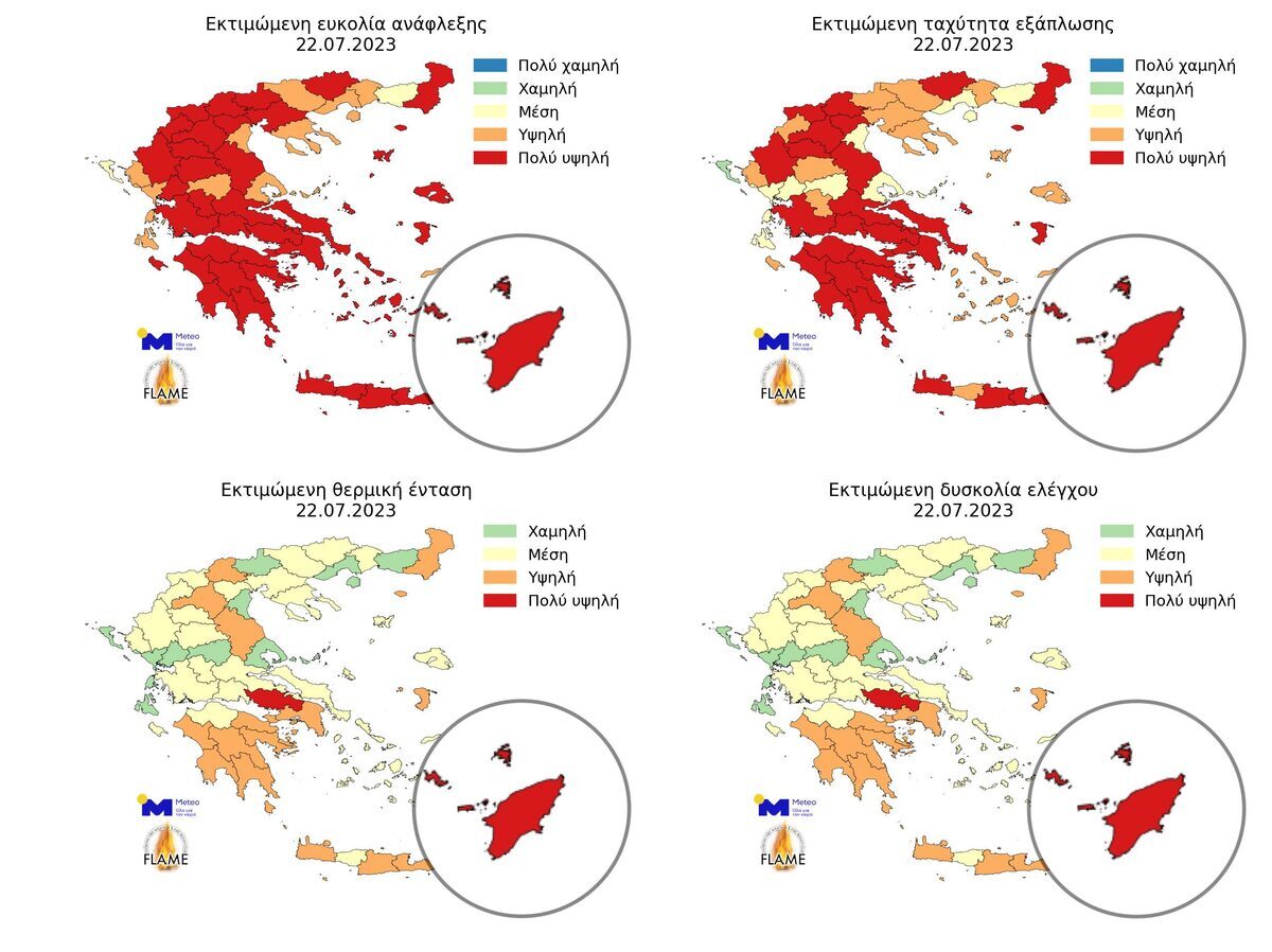 H παρακάτω ομάδα χαρτών αναδεικνύει τους λόγους της σημερινής της έκρηξης. Εκτιμώμενη ευφλεκτότητα, ταχύτητα εξάπλωσης, θερμική ένταση και δυσκολία ελέγχου ήταν σήμερα στο ανώτατο επίπεδο επικινδυνότητας. Η παραπάνω πληροφορία εξάγεται από τον υπολογισμό του Καναδικού Συστήματος Πυρομετεωρολογικών Δεικτών (προσαρμοσμένο στο πυρικό περιβάλλον της Ελλάδας) με βάση τις μετρήσεις των αυτόματων μετεωρολογικών σταθμών της μονάδας ΜΕΤΕΟ του Εθνικού Αστεροσκοπείου Αθηνών (ΕΑΑ). Αυτή ακριβώς η επιτήρηση των πυρομετεωρολογικών συνθηκών αποτελεί απαραίτητο στοιχείο για την ενίσχυση της ετοιμότητας της χώρας μας, μέσα από την υιοθέτηση επιστημονικά τεκμηριωμένων εργαλείων και υπηρεσιών και την αξιοποίηση επιστημονικής γνώσης αιχμής.