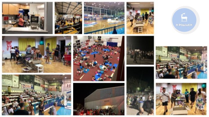 Στο κλειστό γήπεδο του Βενετοκλείου, στην πόλη της Ρόδου συγκεντρώθηκαν κάτοικοι, εργαζόμενοι και τουρίστες από τις περιοχές του νησιού που η πύρινη λαίλαπα έκανε το καταστροφικό πέρασμά της.