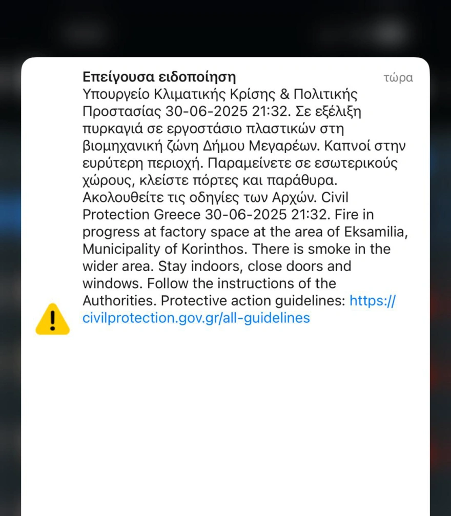 Ειδικότερα, το μήνυμα αναφέρει: « Σε εξέλιξη πυρκαγιά σε εργοστάσιο πλαστικών στη βιομηχανική ζώνη Δήμου Μεγαρέων. Καπνοί στην ευρύτερη περιοχή. Παραμείνετε σε εσωτερικούς χώρους, κλείστε πόρτες και παράθυρα. Ακολουθείτε τις οδηγίες των αρχών».