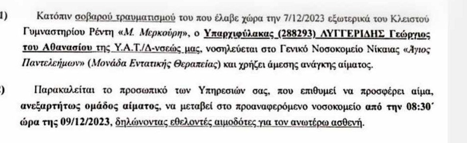 Όπως αναφέρει στην έκκλησή της: «Κατόπιν σοβαρού τραυματισμού του που έλαβε χώρα την 7/12/2023 εξωτερικά του Κλειστού Γυμναστηρίου Ρέντη “Μ. Μερκούρη”, ο υπαρχιφύλακας νοσηλεύεται στο Γενικό Νοσοκομείο Νίκαιας “Άγιος Παντελεήμων” (Μονάδα Εντατικής Θεραπείας) και χρήζει άμεσης ανάγκης αίματος.