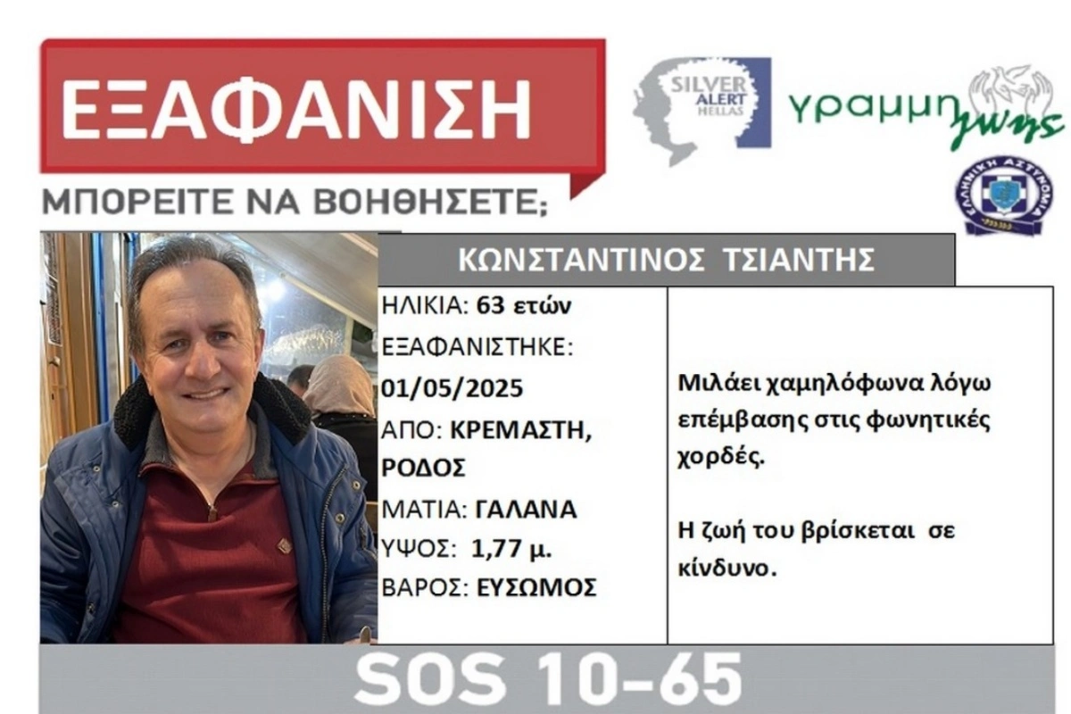 Οι δικοί του άνθρωποι απευθύνουν έκκληση σε όποιον γνωρίζει το παραμικρό να επικοινωνήσει μαζί τους, ενώ μέχρι στιγμής δεν υπάρχουν πληροφορίες που να συμβάλλουν σημαντικά στην πορεία των ερευνών.