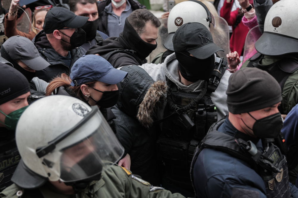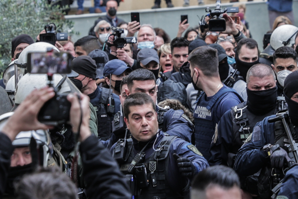 Αστυνομικοί των ΜΑΤ έκαναν κλοιό με τις ασπίδες γύρω από την κατηγορουμένη, η οποία μεταφέρθηκε πεζή από την εισαγγελία στο γραφείο της 18ης ανακρίτριας.