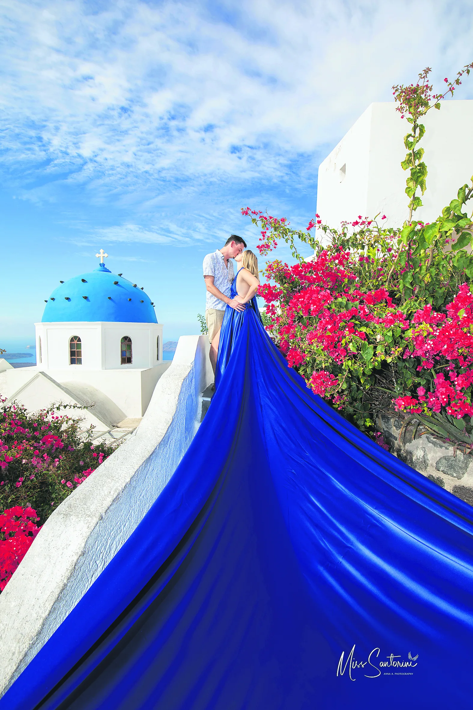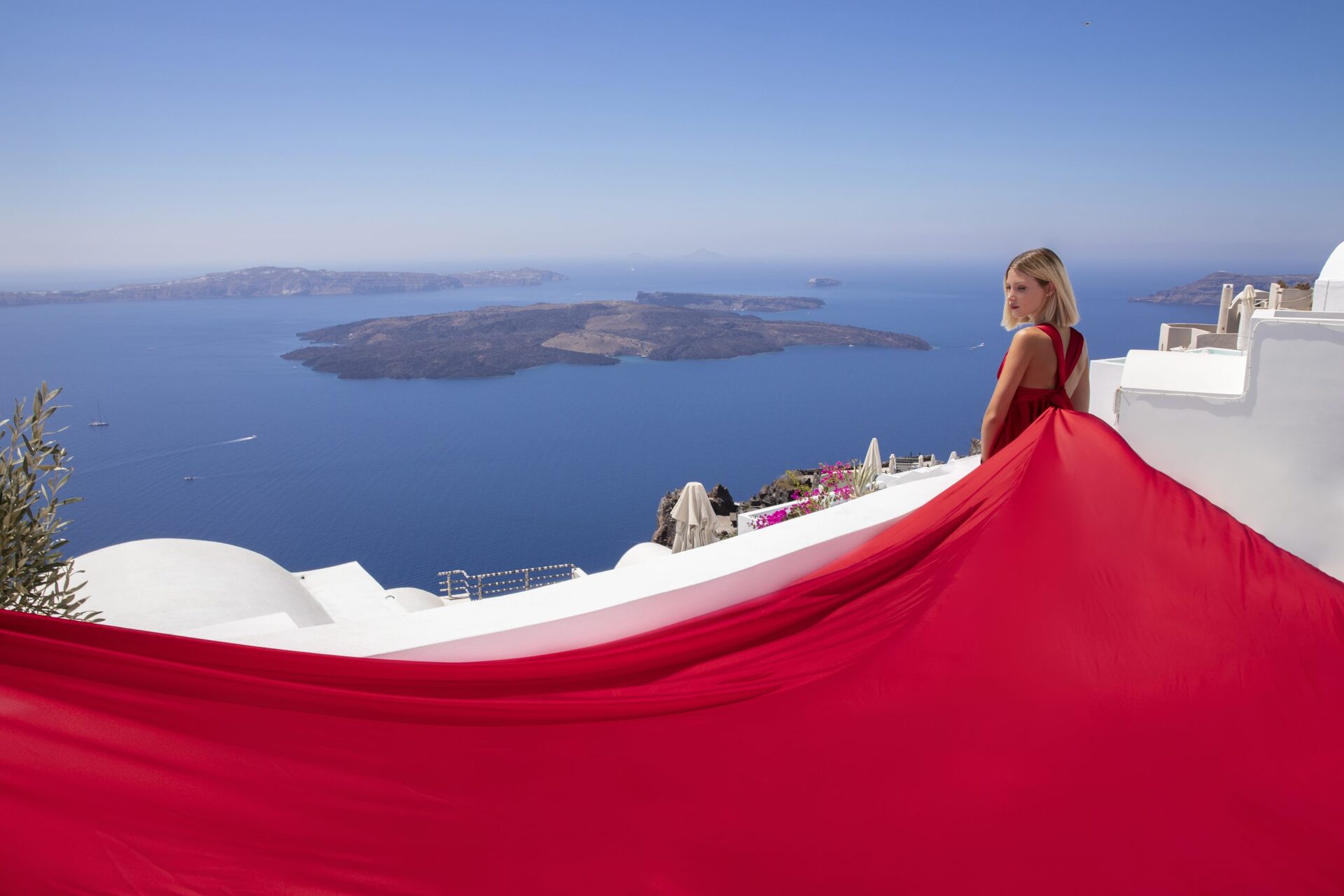 Γυναίκες κυρίως, αλλά και ζευγάρια και χαρούμενες παρέες που ποζάρουν με ενθουσιασμό στον φωτογραφικό φακό για να κερδίσουν ένα κλικ που μοιάζει να αιωρείται ανάμεσα στην θηραική γη και τον ουρανό του Αιγαίου. Η φωτογράφιση με το «φόρεμα που πετάει» έχει γίνει παγκόσμιο trend και πόλος έλξης ακόμα περισσότερων τουριστών στην ήδη δημοφιλή Σαντορίνη. Το πρωτότυπο και απαιτητικό concept έχει και ανάλογο τιμοκατάλογο αφού μια φωτογράφιση ξεκινά από 250 ευρώ ενώ υπάρχουν και πακέτα που μπορεί να ξεπεράσουν τα 1000 ευρώ.