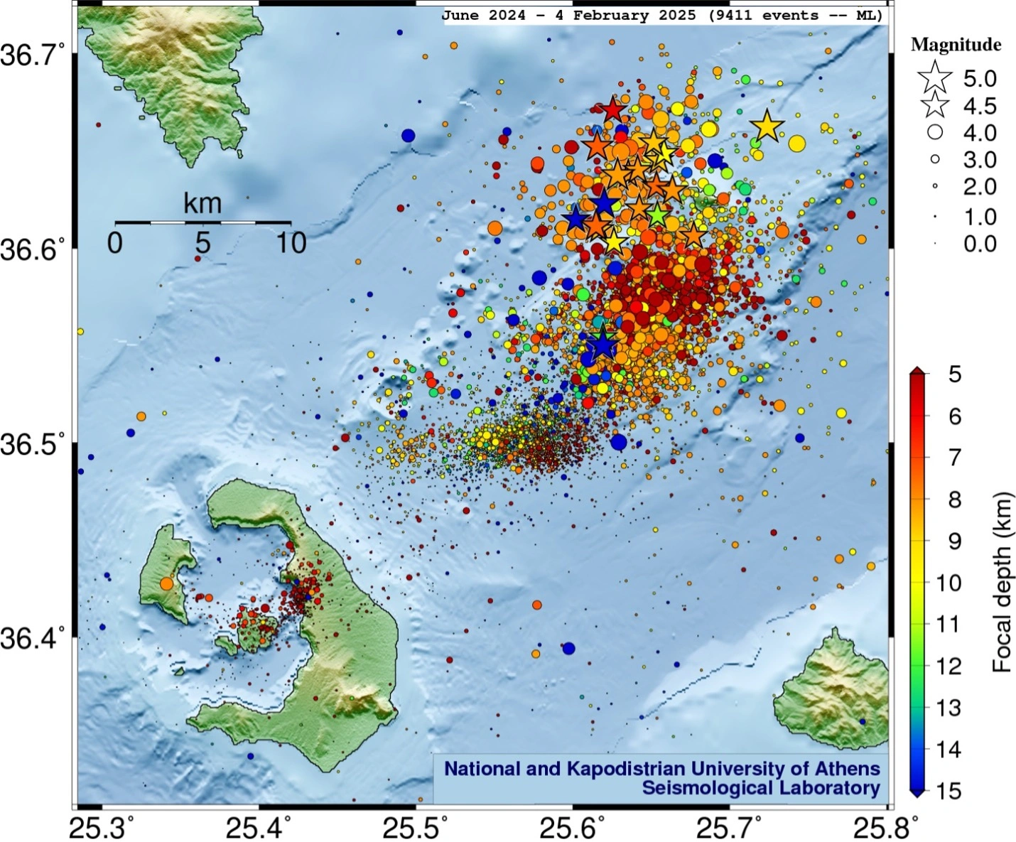 «Από την έναρξη του σεισμικού σμήνους στη ζώνη Σαντορίνης-Αμοργού στις 26 Ιανουαρίου έως και τις 4 Φεβρουαρίου 2025, το Εργαστήριο Σεισμολογίας του ΕΚΠΑ έχει ανιχνεύσει και εντοπίσει συνολικά πάνω από 7,700 σεισμούς με μεθόδους μηχανικής μάθησης, εκ των οποίων άνω των 6,100 με μεγέθη Μ1.0. Στις 4 Φεβρουαρίου καταγράφηκαν πάνω από 1,300 σεισμοί με Μ1.0 (συγκριτικά λιγότεροι απ’ ότι στις 3 Φεβρουαρίου που καταγράφηκαν ~1,450 σεισμοί με Μ1.0). Το μέγιστο μέγεθος έφτασε το 4.9-5.0, ενώ εκδηλώθηκαν 21 σεισμοί με μεγέθη Μ4.0 και 9 σεισμοί με Μ4.5.