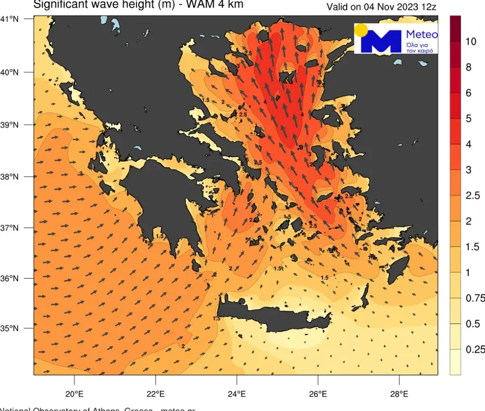 Σύμφωνα με το meteo.gr, λόγω των ισχυρών ανέμων από νότιες διευθύνσεις στο βόρειο Αιγαίο ενδέχεται να σχηματιστούν το Σάββατο κύματα ύψους άνω των 4 μέτρων, όπως θα δείτε και στον προγνωστικό χάρτη που ακολουθεί.