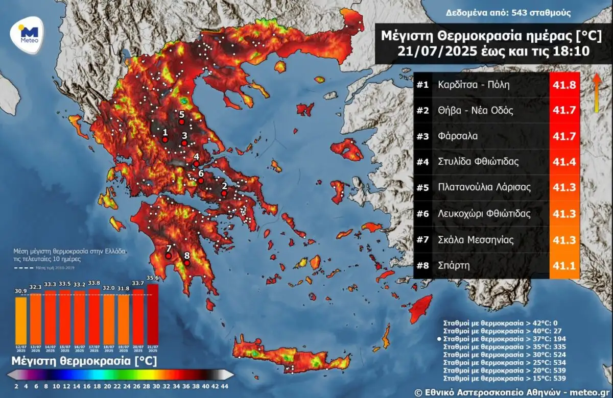Η μεγαλύτερη τιμή καταγράφηκε στην Καρδίτσα και έφτασε τους 41,8 βαθμούς Κελσίου.