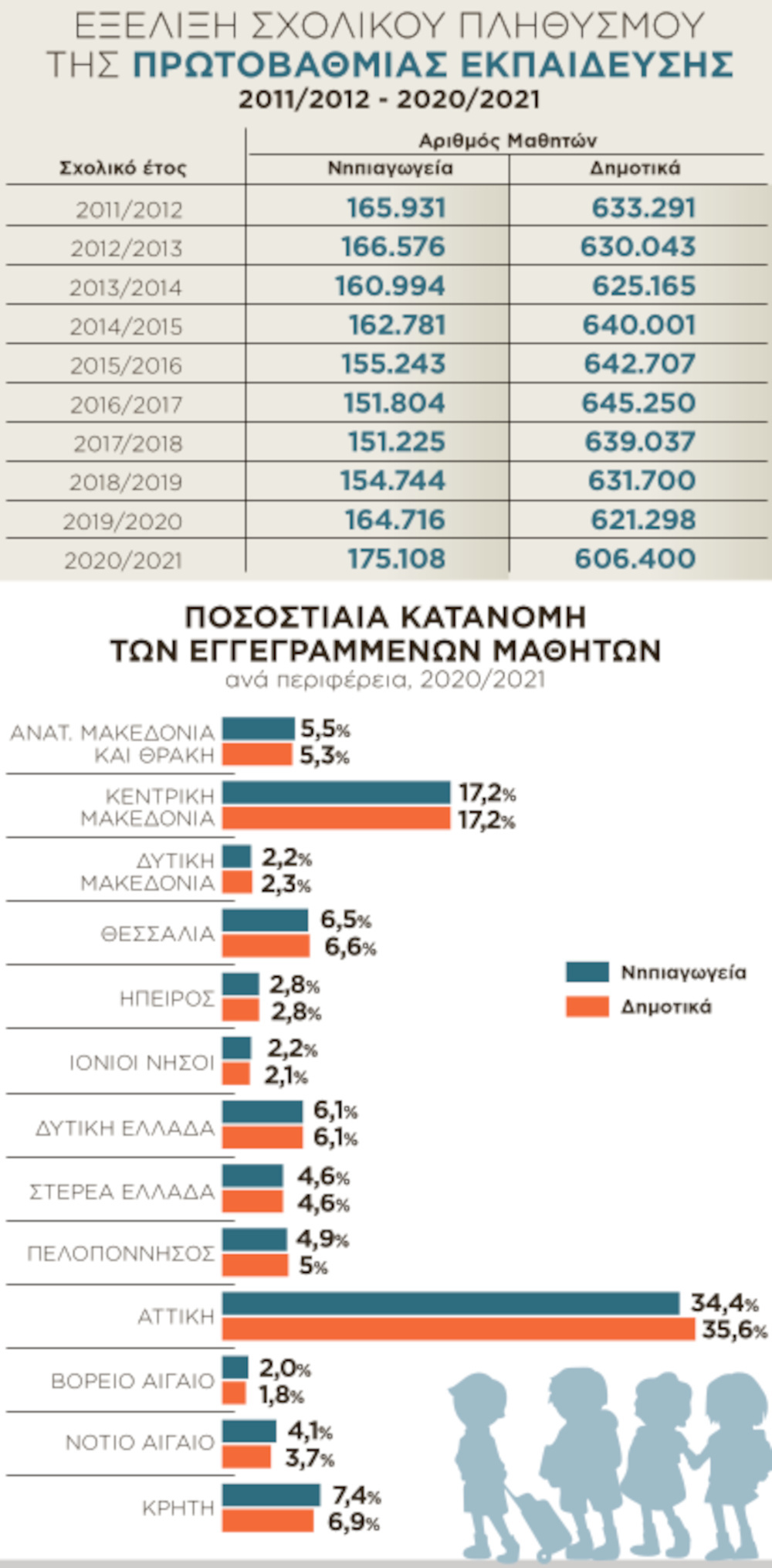 Το έτος 2011-2012 οι μαθητές ήταν 633.291, κατεγράφη μια άνοδος την τριετία 2015 έως 2017 που έφτασε μέχρι τους 645.250 μαθητές κι έκτοτε οι δείκτες καταγράφουν μόνο πτώση, με το σχολικό έτος 2020-2021 οι εγγεγραμμένοι μαθητές στα Δημοτικά να έχουν περιοριστεί στους 606.400.