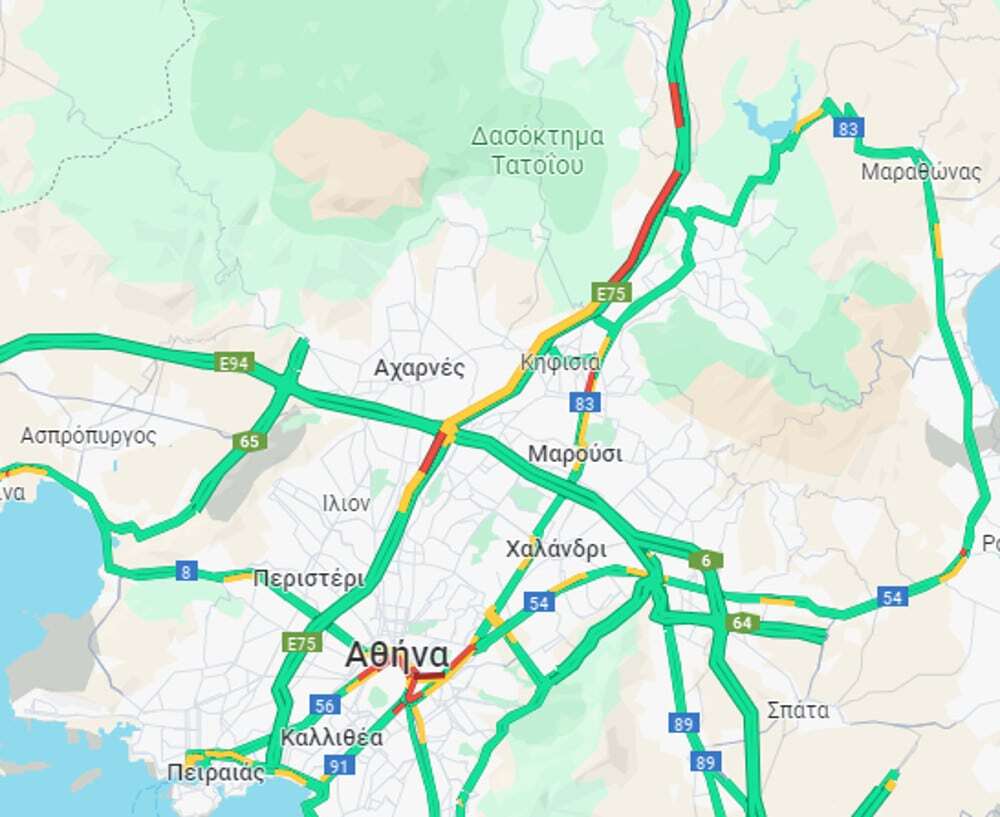 Παράλληλα, στο «κόκκινο» βρίσκονται και κεντρικοί δρόμοι στην Αθήνα, όπως η Λεωφόρος Αλεξάνδρας, η Μεσογείων, η Κηφισίας στην άνοδο αλλά και στην κάθοδο ανά τμήματα, η Πανεπιστημίου, η Σταδίου και η Βασιλίσσης Αμαλίας.