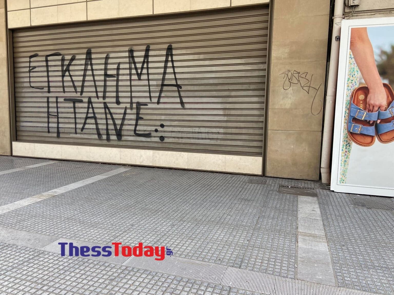 Το περιστατικό σημειώθηκε ενώ ήταν σε εξέλιξη η μεγάλη πορεία για την επέτειο των Τεμπών που ξεκίνησε από την Καμάρα. Μάλιστα τα άτομα έγραψαν και συνθήματα σε προστατευτικά ρολά καταστημάτων.